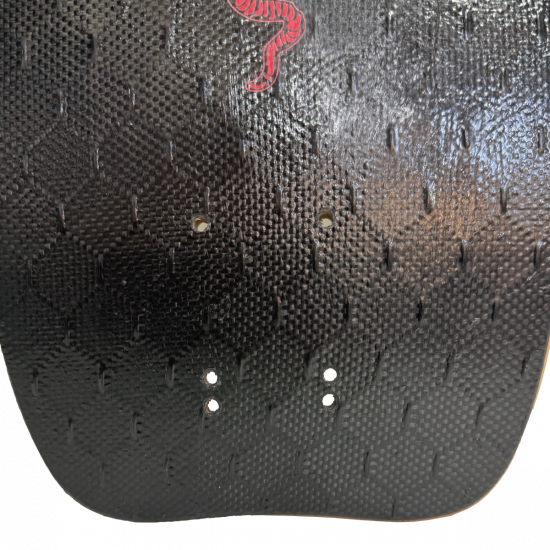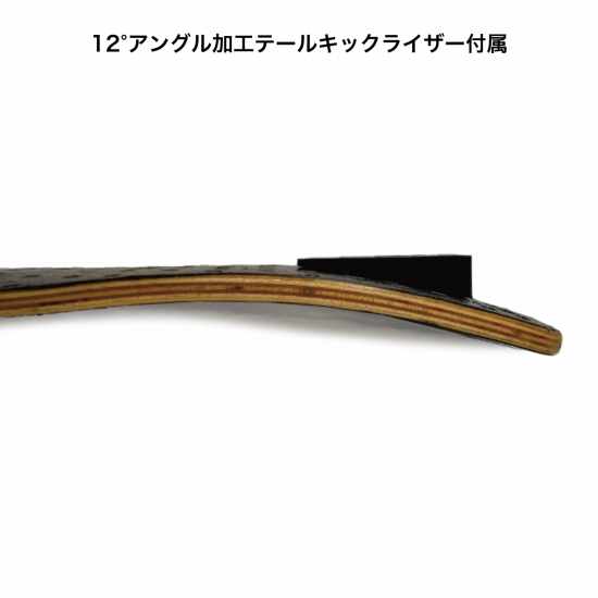 シングルキックの原板から、コーンケーブを深く削りカーボンファイバーでサンドイッチし、乗り味の硬い、戦闘能力の高いデッキ。踏めば踏むほど加速し、勝つ為のレーシングボードに仕上がりました。